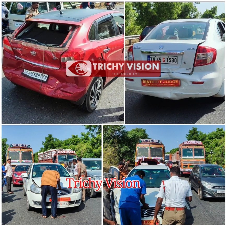 தேசிய நெடுஞ்சாலையில் நொடி பொழுதில் நடந்த இந்த விபத்தினால் அதே வழியில் வந்த தனியார் பள்ளி பேருந்து, மோட்டார் வாகன விபத்து காப்பீடு கோருதல் மாவட்ட நீதிபதி வாகனம், மற்றொரு கார் மற்றும் லாரி உள்ளிட்ட 4 வாகனம் ஒரே நேரத்தில் அடுத்தடுத்து மோதிக்கொண்டு விபத்துக்குள்ளானது.