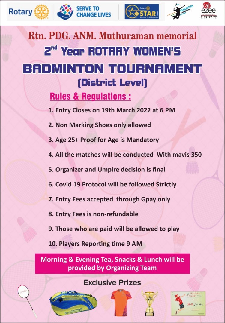 Rtn.PDG. முத்துராமன் நினைவு இரண்டாம் ஆண்டு பேட்மிட்டன் போட்டி நடைபெற உள்ளது.