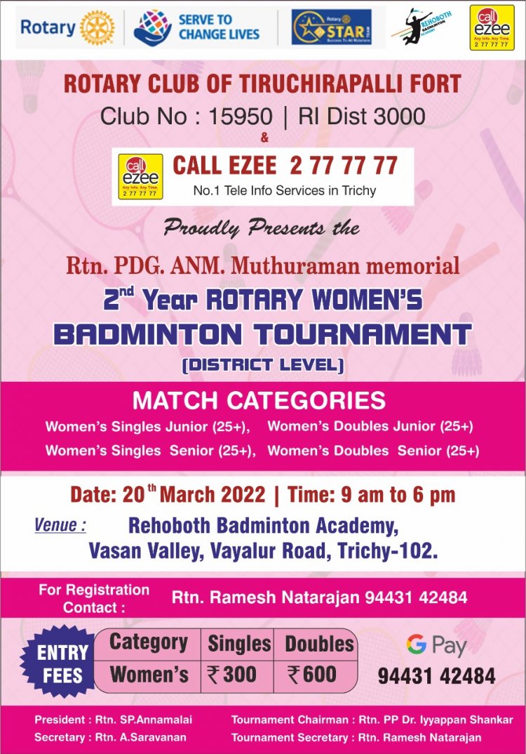திருச்சிராப்பள்ளி ஃபோர்ட் ரோட்டரி கிளப் மற்றும் callezee நிறுவனம் இணைந்து வழங்கும் மாவட்ட அளவிலான “பேட்மிட்டன் டோர்னமெண்ட் “.