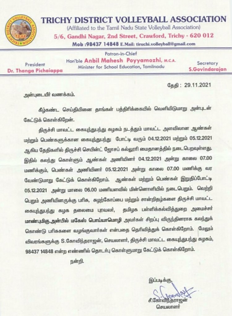 திருச்சி மாவட்ட கையுந்து பந்து கழகம் நடத்தும் மாவட்ட அளவிலான ஆண்கள் மற்றும் பெண்களுக்கான கையுந்து பந்து போட்டி வரும் 04.12.2021 மற்றும் 05.12.2021 ஆகிய தேதிகளில் திருச்சி செயின்ட் ஜோசப் கல்லூரி மைதானத்தில் நடைபெற உள்ளது.