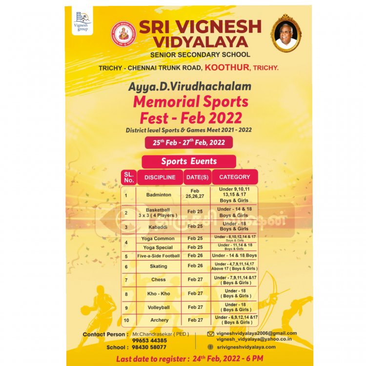 திருச்சி ஸ்ரீ விக்னேஷ் வித்யாலயா பள்ளியின் நிறுவனர் D.விருதாச்சலம் நினைவு நாளை முன்னிட்டு மாவட்ட அளவில் பள்ளி மாணவ மாணவியர்களுக்கு இடையேயான விளையாட்டு போட்டிகள் நடைபெற உள்ளது.