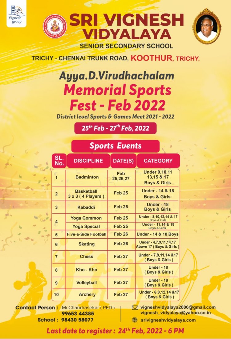 திருச்சி ஸ்ரீ விக்னேஷ் வித்யாலயா பள்ளியின் நிறுவனர் D.விருதாச்சலம் நினைவு நாளை முன்னிட்டு மாவட்ட அளவில் பள்ளி மாணவ மாணவியர்களுக்கு இடையேயான விளையாட்டு போட்டிகள் நடைபெற உள்ளது.