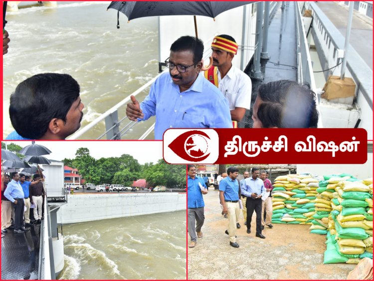 திருச்சிராப்பள்ளி மாவட்டம் முக்கொம்பு காவிரி நீர்வரத்து மற்றும் காவிரி கொள்ளிடத்தில் நீர் வெளியேற்றம் அதிகரித்துள்ளது தொடர்ந்து மாவட்ட கண்காணிப்பு அலுவலர் மற்றும் பொதுப்பணித்துறை முதன்மை செயலாளர் டாக்டர் மணிகண்டன் இன்று முக்கொம்பு மேலணையில் நேரில் பார்வையிட்ட ஆய்வு செய்து தேவையான பாதுகாப்பு நடவடிக்கைகளை மேற்கொள்ளவும் முழு கண்காணிப்புடன் பணியாற்றியடவும் அலுவலர்களுக்கு உத்தரவிட்டார்.