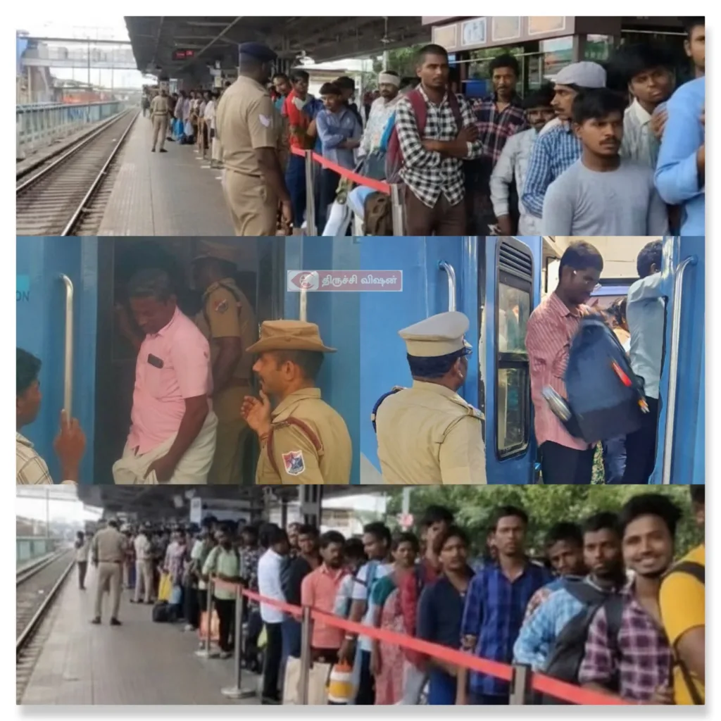 தீபாவளி பண்டிகையை முன்னிட்டு, திருச்சி ரயில் நிலையத்தில் பயணிகள் பெருமளவில் திரண்டுள்ளனர். தங்கள் சொந்த ஊர்களுக்கு செல்லும் மக்கள் குடும்பத்துடன் ரயில் மற்றும் பேருந்து நிலையங்களில் கூட்டமாக வந்துள்ளனர்.இதனால், திருச்சி ரயில் நிலையத்தில் பயணிகளின் நெரிசலை சமாளிக்க ரயில்வே கோட்ட மேலாளர் உத்தரவின்பேரில் ரயில்வே பாதுகாப்புப் படையினர் (RPF) தீவிர பாதுகாப்பு பணியில் ஈடுபட்டுள்ளனர்.அவர்கள் பயணிகளை வரிசைப்படுத்தி நிறுத்தி, ரயில்களில் ஒழுங்காகவும் பாதுகாப்பாகவும் ஏறிச் செல்ல வழிவகுத்து வருகின்றனர். ரயில் நிலையம் முழுவதும் கூடுதல் பாதுகாப்பு ஏற்பாடுகள் செய்யப்பட்டுள்ளன.