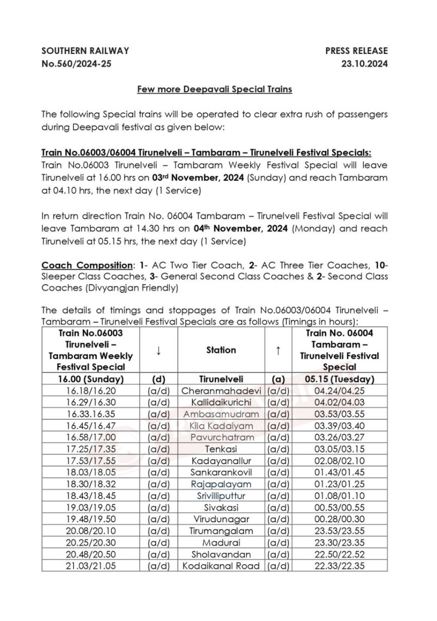 இந்த நிலையில், தென்மண்டல ரயில்வே நிர்வாகம் திருநெல்வேலியில் இருந்து சிவகாசி, மதுரை, திருச்சி வழியாக தாம்பரம் செல்வதற்கு சிறப்பு ரயிலை இயக்கவுள்ளது.