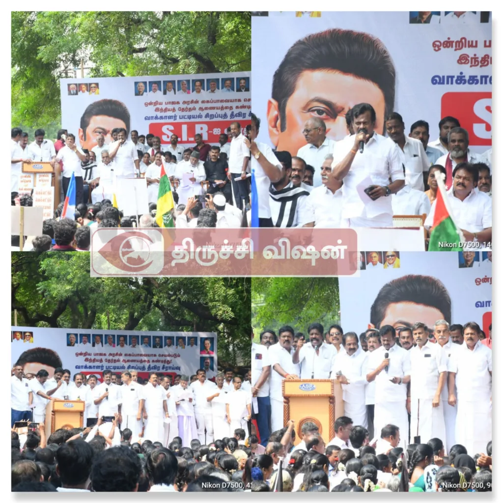 சிறப்பு வாக்காளர் திருத்தச் சட்டத்தை கண்டித்து தமிழக முழுவதும் இன்று திமுக கூட்டணி கட்சியான விடுதலை சிறுத்தைகள் கட்சி, காங்கிரஸ் கம்யூனிஸ்ட், மக்கள் நீதி மையம் உட்பட கட்சியினர் இன்று மத்திய அரசின் கைப்பாவையாக செயல்படும் தேர்தல் ஆணையத்தை கண்டித்து கண்டன ஆர்ப்பாட்டத்தில் நடைபெற்று வருகிறது.