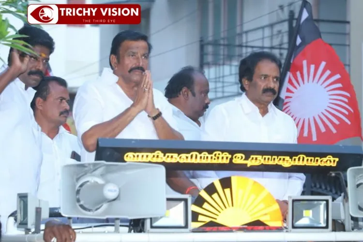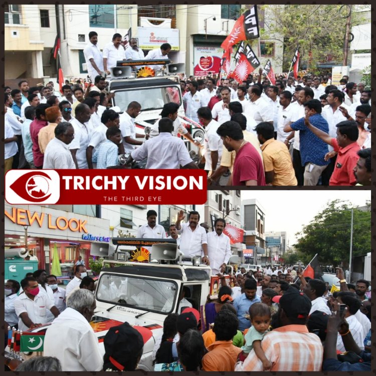 திருச்சி மேற்கு தொகுதியில் திமுக வேட்பாளர் கே.என்.நேரு தொண்டர்கள் படைசூழ முதல் நாள் பரப்புரை