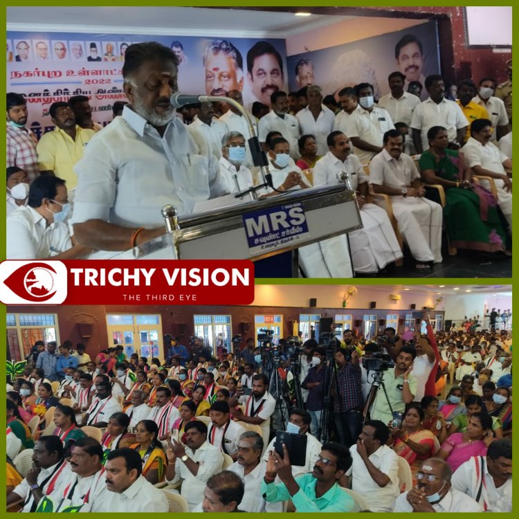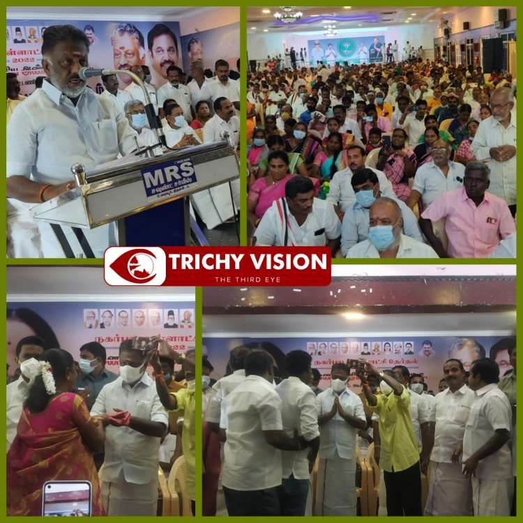 திருச்சி காஜாமலை பகுதியிலுள்ள  தனியார் திருமண மண்டபத்தில் திருச்சி மாவட்டத்தில் போட்டியிடும் மாநகராட்சி, நகராட்சி, பேரூராட்சி அதிமுக,தமாக வேட்பாளர்கள் இதில் கலந்துகொண்டனர்.அதிமுக,தமாகா கூட்டணி வேட்பாளர்களை ஆதரித்து அதிமுக ஒருங்கிணைப்பாளர்   ஓ.பன்னீர்செல்வம் பிரச்சார கூட்டத்தில் பேசினார்.