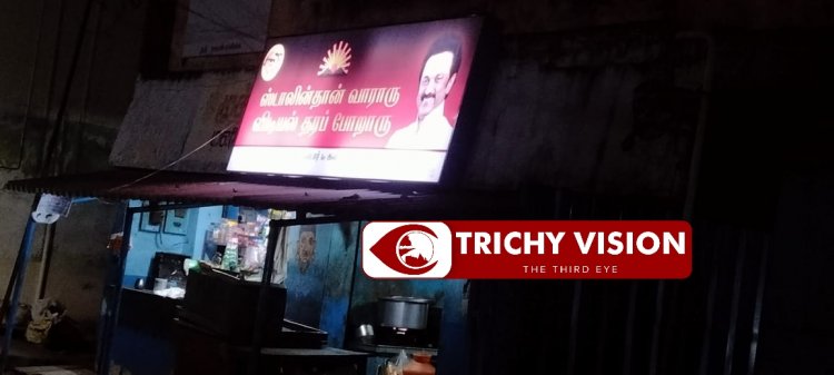 பொதுவாக வணிகர்கள் கடையில் பல்வேறு நிறுவனங்கள் சார்பில் பெயர் பலகை வைக்கப்பட்டு இருக்கும். ஆனால் எதிர்பார்த்துக் கொண்டிருக்கும் இந்த தேர்தலை வித்தியாசமான முறையில் வாக்காளர்களை கவர்வதற்காக திமுக சார்பில் இந்த பிரச்சார பதாகை கையாளப்பட்டிருக்கிறது. திருச்சி மேற்கு தொகுதி உட்பட்ட இந்த பகுதியில் மளிகை கடை, டிபன் கடை, இறைச்சிக் கடை உள்ளிட்ட பல்வேறு கடைகளில் பெயர் குறிப்பிட்டு திமுக தேர்தல் பிரச்சாரம் வாசகத்தோடு இந்த பதாகைகள் வைக்கப்பட்டுள்ளன.