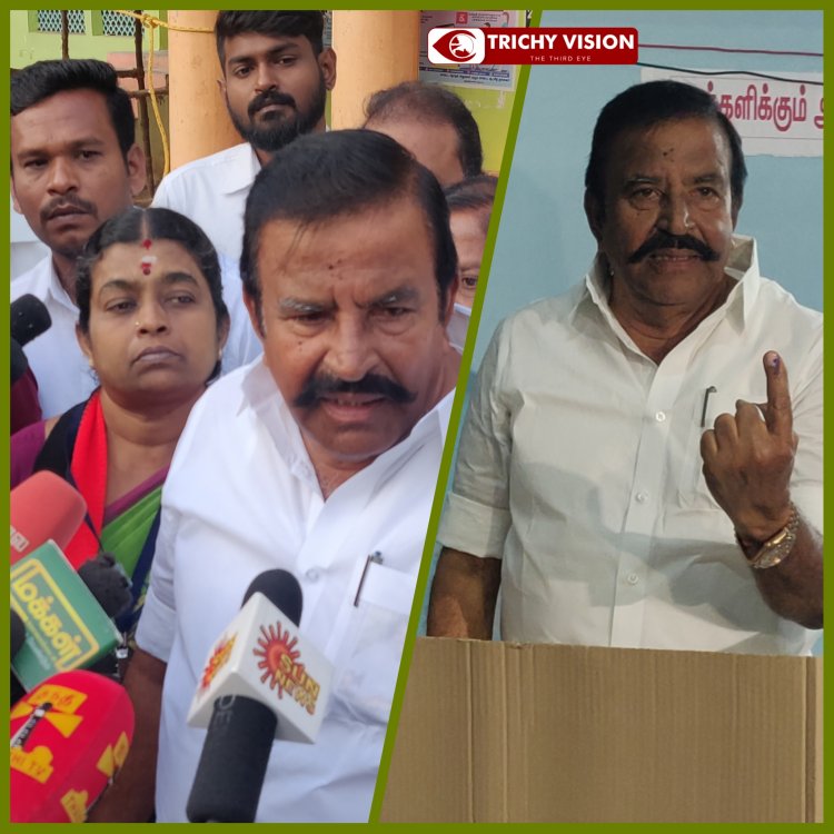 நகர்ப்புற உள்ளாட்சி தேர்தலில் அனைத்து இடங்களிலும் திமுக வெற்றி பெறுமதிருச்சி தில்லைநகர் மக்கள் மன்றத்தில் நகராட்சி நிர்வாகத்துறை அமைச்சர் கே.என். நேரு தனது வாக்கை பதிவு செய்தார்.