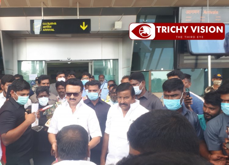 திருவாரூர் மாவட்டம் திருக்குவளையில் இன்று மாலை தனது பிரச்சாரத்தை துவங்குவதற்காக திமுக தலைவர் மு.க ஸ்டாலின் திருச்சி சர்வதேச விமான நிலையம் வந்தடைந்தார். திருச்சி விமான நிலையம் வந்த அவருக்கு உற்சாக வரவேற்பு அளிக்கப்பட்டது.