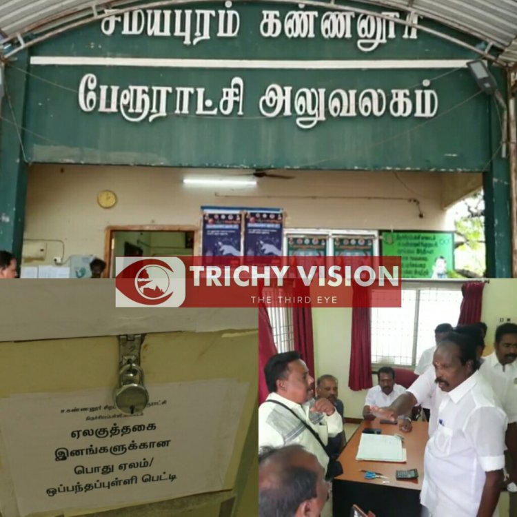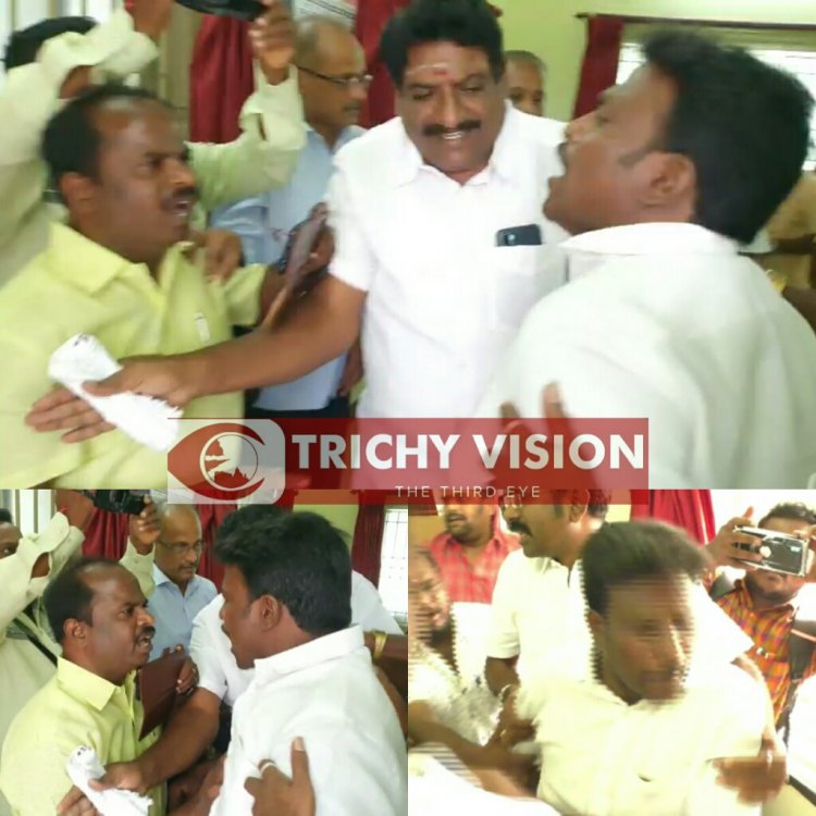 திருச்சி சமயபுரம் கண்ணனூர் பேரூராட்சி சார்பில் வாகன வரி வசூல் ஒப்பந்தப்புள்ளி டெண்டர் பெட்டியினை சீல் வைத்து மூடாமல் வெறும் பூட்டு போட்டு பூட்டியுள்ளதால் முறைகேடு நடந்துள்ளது எனக் கூறிய ஒப்பந்ததாரரை தாக்க முயன்ற திமுகவினர்.