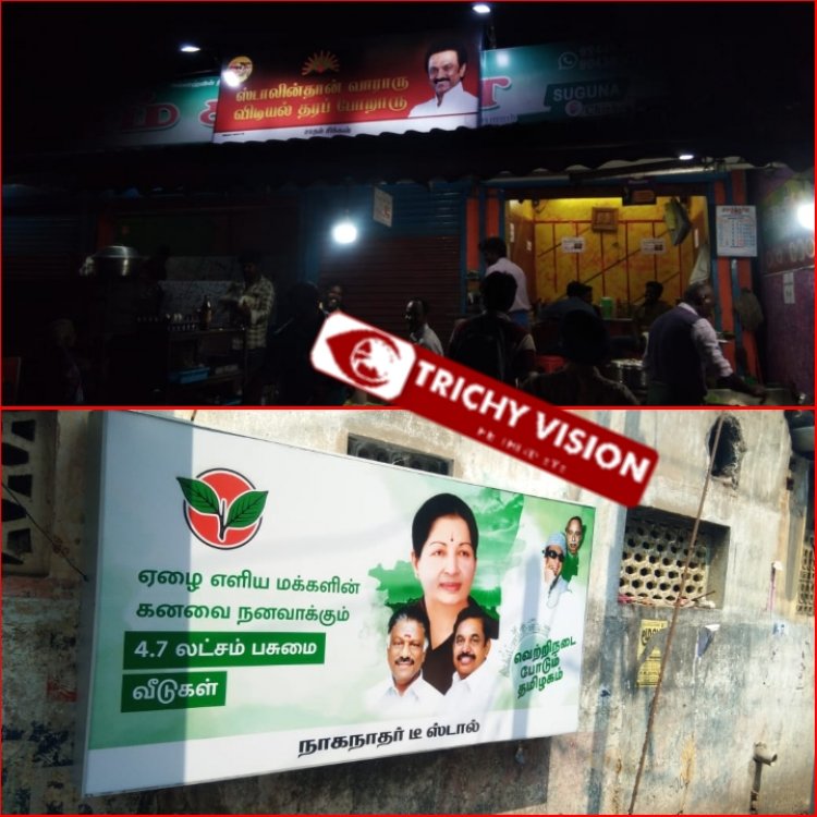 குறிப்பாக வாக்காளர்களை கவரும் வகையில் சமூக வலைத்தளங்களில் விதவிதமான தேர்தல் விளம்பரம் அதிகளவு காணப்படுகிறது. இந்நிலையில் திருச்சி மேற்கு தொகுதியில் 45வது பகுதியில் திமுக மற்றும் அதிமுகவினர் போட்டி போட்டு கொண்டு தேர்தல் பிரச்சார விளம்பரங்களை செய்து வருகின்றனர். கடந்த மாதம் பெரியமிளகுபாறை பகுதியில் உள்ள மளிகை கடை, டிபன் கடை, இறைச்சி கடை உள்ளிட்டவைகளின் பெயர் பலகைக்கு பதிலாக திமுகவின் தேர்தல் பிரச்சார வாசகங்கள் *( ஸ்டாலின் தான் வாராரு விடியல் தர போறாரு )* இடம் பெற்ற ஒளிரும் பெயர் பலகை வைக்கப்பட்டது.