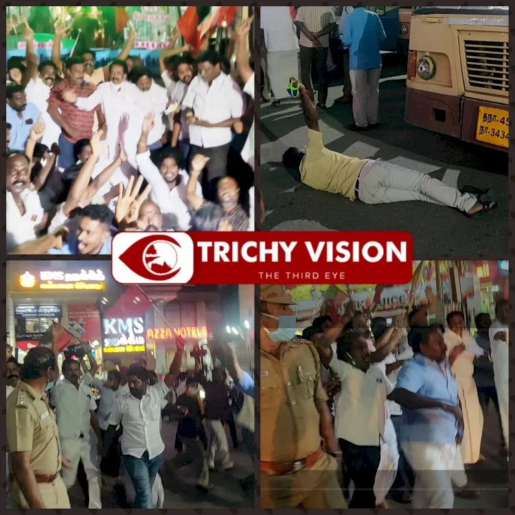 கோவிட் பெருந்தொற்றால் 144 தடை உத்தரவு இருக்கும் நேரத்தில் நாகை மாவட்டம் திருக்குவளையில் தேர்தல் பரப்புரை செய்த திமுக இளைஞரணி செயலாளர் உதயநிதி ஸ்டாலின் கைது செய்யப்பட்டார். இதனையடுத்து திருச்சியில் திமுக வினர் மத்திய பேருந்து நிலையம், அண்ணா சிலை, ஸ்ரீரங்கம் உள்ளிட்ட பகுதிகளில் தங்களது எதிர்ப்பை பதிவு செய்தனர். முன்னதாக திருச்சி மத்திய பேருந்து நிலையத்தில் திமுகவினர் முன்னாள் துணை மேயர் அன்பழகன் தலைமையில் 50க்கும் மேற்பட்டோர் மத்திய பேருந்து நிலையத்திற்க்கு பேரணியாக வந்து மறியலில் ஈடுபட்டனர்.