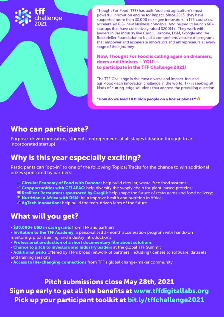 “வருமுன் காப்பதே சிறந்தது” என்பது போல தற்போது நடந்து வரும் சுற்றுச்சூழலுக்கு எதிரான காற்று மாசுபாடு, நீர் மாசுபாடு கருத்தில் கொண்டு எதிர்வரும் 2050ம் ஆண்டு 10 பில்லியன் பேருக்கு விவசாயம் செய்து உணவளிக்க உங்களிடம் ஐடியா இருந்தால் அதனை இந்த உலக அளவில் எடுத்துச் சென்று அங்கீகாரம் தர காத்திருக்கின்றனர் Thought For Food (TFF) அமைப்பினர்.