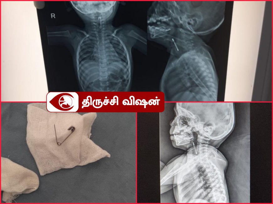 திருச்சி அரசு மருத்துவமனையில் சிகிச்சைக்காக அனுமதிக்கப்பட்ட குழந்தைக்கு எக்ஸ்ரே எடுத்து பார்த்த பொழுது குழந்தை ஊக்கினை (safety Pin) விழுங்கி உள்ளது தெரிய வந்துள்ளது. ஊக்கு திறந்த நிலையில் குழந்தையின் தொண்டை பகுதியில் சிக்கியிருந்தது.