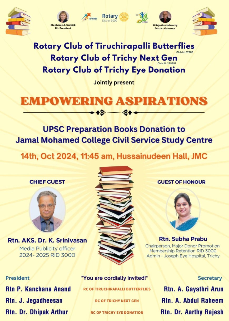 Rotary Club of Tiruchirapalli Butterflies Club id: 87905, Rotary Club of Trichy Next Gen, Rotary Club of Trichy Eye Donation இணைந்து சிவில் சர்வீஸ் படிப்பு மையத்திற்கு UPSC தயாரிப்பு புத்தகங்கள் நன்கொடை வழங்கும் விழா ஜமால் முகமது கல்லூரி 14, அக்டோபர் 2024, காலை 11:45, ஹுசைனுதீன் ஹாலில் நடைபெற உள்ளது.