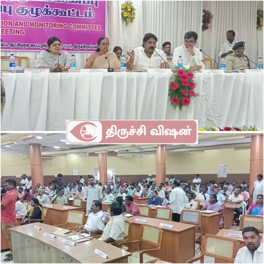 திருச்சி மாவட்ட ஊரக வளர்ச்சி மற்றும் ஊராட்சித்துறை மாவட்ட ஊரக வளர்ச்சி முகமை சார்பில் மாவட்ட வளர்ச்சி ஒருங்கிணைப்பு மற்றும் கண்காணிப்பு குழு கூட்டம் திருச்சி மாவட்ட ஆட்சியர் அலுவலகத்தில் நடைபெற்று வருகிறது. இந்தக் கூட்டத்தில் திருச்சி பாராளுமன்ற உறுப்பினர் துரை வைகோ, கரூர் பாராளுமன்ற உறுப்பினர் ஜோதிமணி,