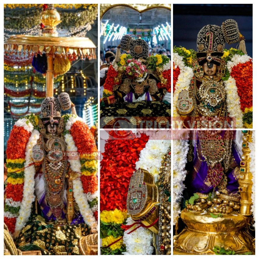 கர்ண பத்திரம்; வைர அபய ஹஸ்தம்; திரு மார்பில் பங்குனி உத்திர பதக்கம்; அதன் மேல் சந்திர ஹாரம், அதனுள் ஸ்ரீ ரங்க நாச்சியார் பதக்கம், அடுக்கு பதக்கங்கள், நெல்லிக்காய் மாலை, 18 பிடி (6 வட) முத்து சரம், தங்க பூண் பவழ மாலை; பின்புறம் – புஜ கீர்த்தி; அண்ட பேரண்ட பக்ஷி பதக்கம்; கையில் தாயத்து சரங்கள்; தங்க தண்டைகள் திருவடியில் அணிந்து சேவை சாதிக்கிறார்.
