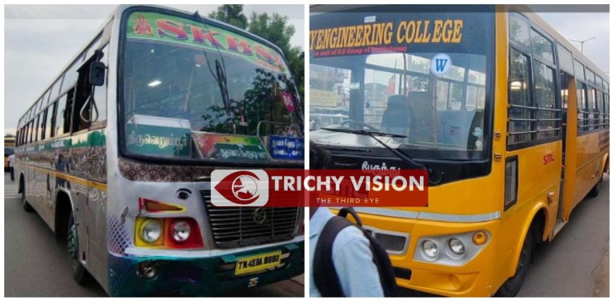 அப்போது திருவெறும்பூர் பேருந்து நிறுத்ததில் மாணவர்களை இறக்கிவிட்டு கிளம்பிய தனியார் கல்லூரி பேருந்தின் மீது உரசியதால் தனியார் பேருந்து ஜன்னல் கண்ணாடி உடைந்து குத்தியதில் தனியார் பேருந்தில் சென்ற பயனி ஒருவருக்கு கையில் காயம் ஏற்பட்டது.