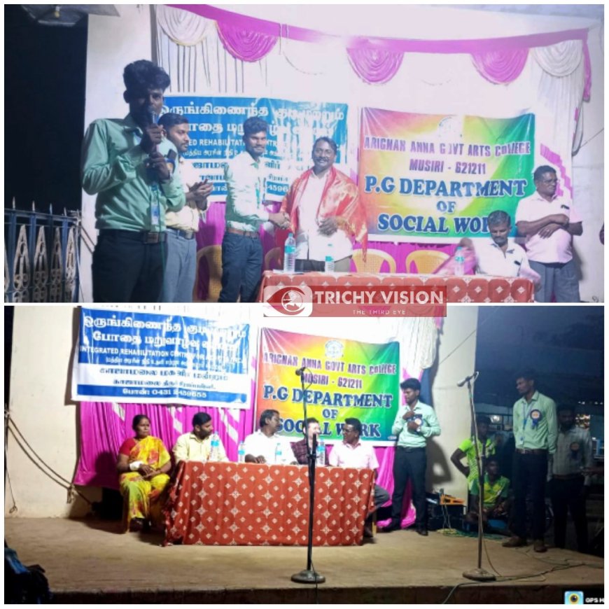 திருச்சி மாவட்டம் மருங்காபுரி வட்டம் தேனூர் கிராமத்தில் அறிஞர் அண்ணா அரசு கலைக் கல்லூரி முசிறி சமூக பணித்துறை மாணவர்கள் மற்றும் திருச்சி காஜாமலை மகளிர் மன்றம் குடிபோதை மறுவாழ்வ மையம் இணைந்து குடிபோதை மற்றும் செல்போன் அடிமை பற்றிய விழிப்புணர்வு நிகழ்ச்சி நடைபெற்றது.