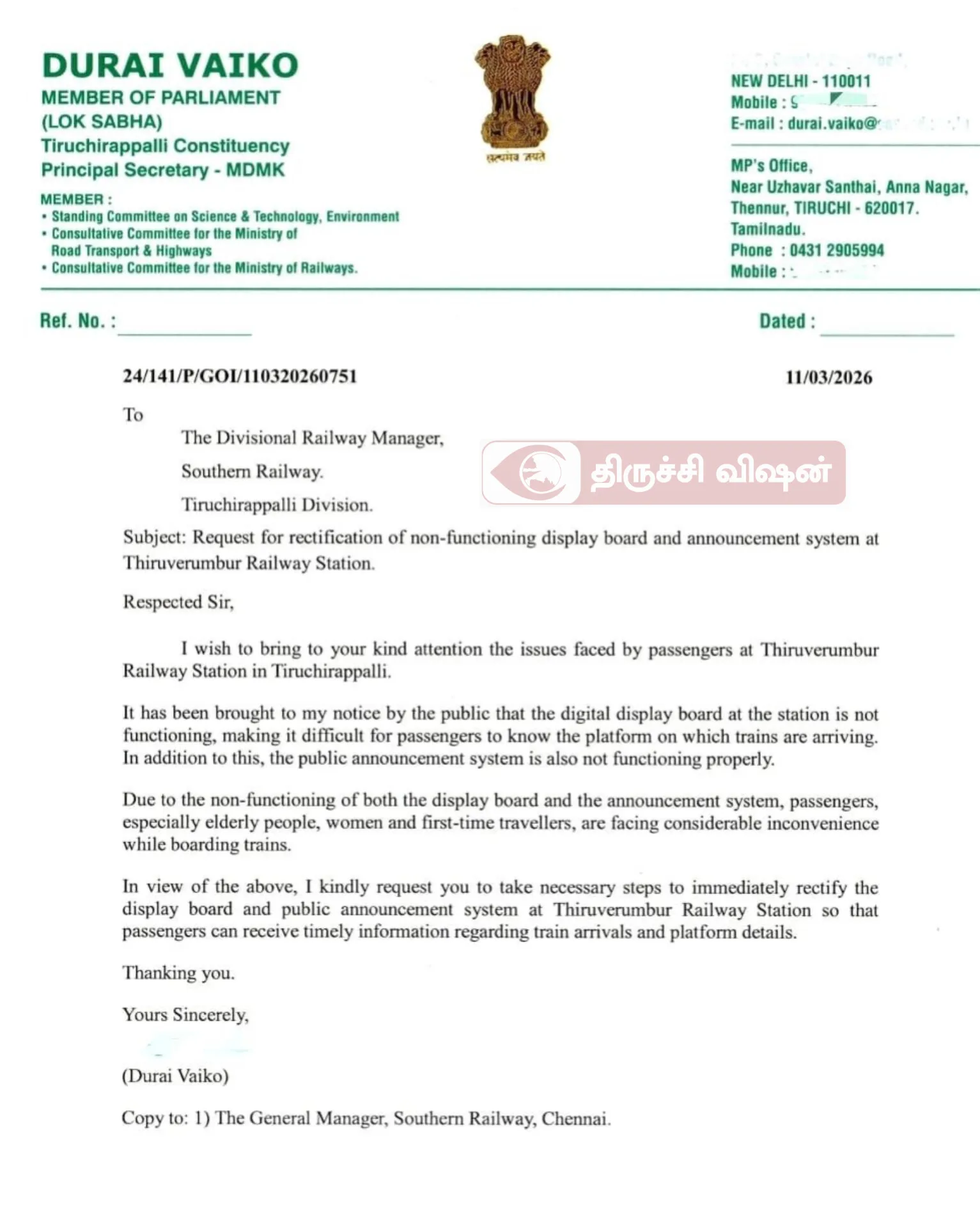 இந்த பிரச்சினை குறித்து இன்று (13.03.2026) தெற்கு ரயில்வே திருச்சி கோட்டத்தின் கோட்ட மேலாளர் (DRM) அவர்களுக்கு கடிதம் மற்றும் தொலைபேசியில் தொடர்பு கொண்டு எடுத்துரைத்தேன். அதற்கு அவர் இந்த பிரச்சினையை உடனடியாக கவனித்து விரைவில் சரிசெய்ய தேவையான நடவடிக்கை எடுக்கப்படும் என உறுதி அளித்தார்.