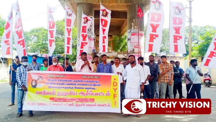 இபியை கண்டித்து DYFI அமைப்பினர் சார்பில் திருச்சி தென்னூர் மின்வாரிய அலுவலகத்திற்கு முன்பாக கண்டன ஆர்ப்பாட்டத்தில் ஈடுபட்டனர்.