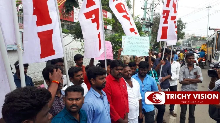 அஞ்சல்துறை காலிப்பணியிடங்களை பூர்த்தி செய்ய தமிழகத்தில் பிப்ரவரி 14ம்தேதி நடைபெறவுள்ள தேர்வில் தமிழ்மொழி புறக்கணிக்கப்பட்டு இந்தி மற்றும் ஆங்கில மொழியில் மட்டுமே தேர்வு நடத்தப்படும் என்ற அஞ்சல்துறையின் அறிவிப்பினைக் கண்டித்தும், தமிழில் தேர்வு நடத்திட மத்திய, மாநில அரசுகள் நடவடிக்கை எடுக்க வலியுறுத்தி இந்திய ஜனநாயக வாலிபர் சங்கம் சார்பில் மாவட்ட செயலாளர் லெனின் தலைமையில் இளைஞர்கள் 50க்கும் மேற்பட்டோர் திருச்சி தலைமைத் தபால்நிலையம் முன்பு கண்டன ஆர்பாட்டத்தில் ஈடுபட்டனர்.