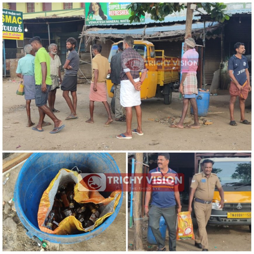 திருச்சி மாவட்டம், சமயபுரம் நால்ரோடு அருகே 2 அரசு டாஸ்மாக் கடைகள் செய்யப்பட்டு வருகிறது. இந்நிலையில் இன்று அதிகாலையில் இருந்து டாஸ்மாக் கடைகள் அருகே சிலர் சட்டவிரோதமாக மதுபாட்டில்களை பதுக்கி வைத்து விற்பனை செய்வதாக சமயபுரம் போலீசாருக்கு தகவல் கிடைத்தது.