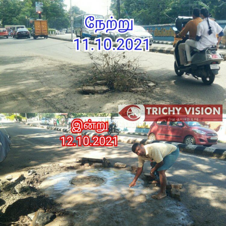 தொடர்ந்து இந்த அபாயகரமான பள்ளத்தை பெரிய கற்கள் மற்றும் மரக்கிளைகளை கொண்டு இந்த பள்ளத்தை மூடி இருந்தனர்.அவ்வழியாக வரும் வாகன ஓட்டிகள் சிரமம் குறித்து நேற்று (11.10.2021) திருச்சி விஷன் செய்தி வெளியிட்டது.