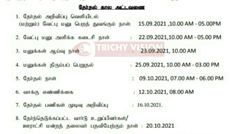 பதவியிடங்களுக்கு தேர்தல் அறிவிப்பு செய்யப்பட்டு, கீழ்காணும் அட்டவணைப்படி 09.10.2021 அன்று வாக்குப்பதிவு நடைபெறவுள்ளது.