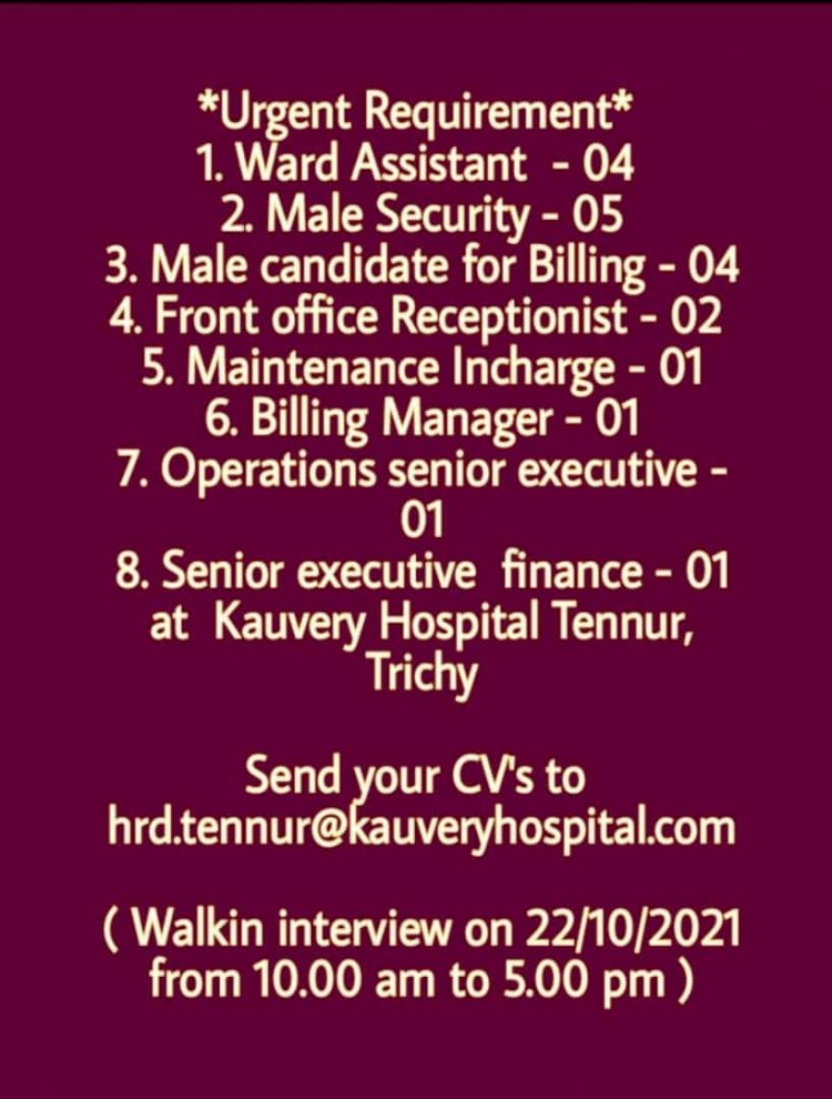 திருச்சி தென்னூர் காவேரி மருத்துவமனையில் பல்வேறு பிரிவுகளில் உள்ள பணியிடங்களுக்கு வேலை வாய்ப்புகள் அறிவிக்கப்பட்டுள்ளது. மேலும் விபரங்களுக்கு கீழே உள்ள படத்தை பார்க்கவும்.