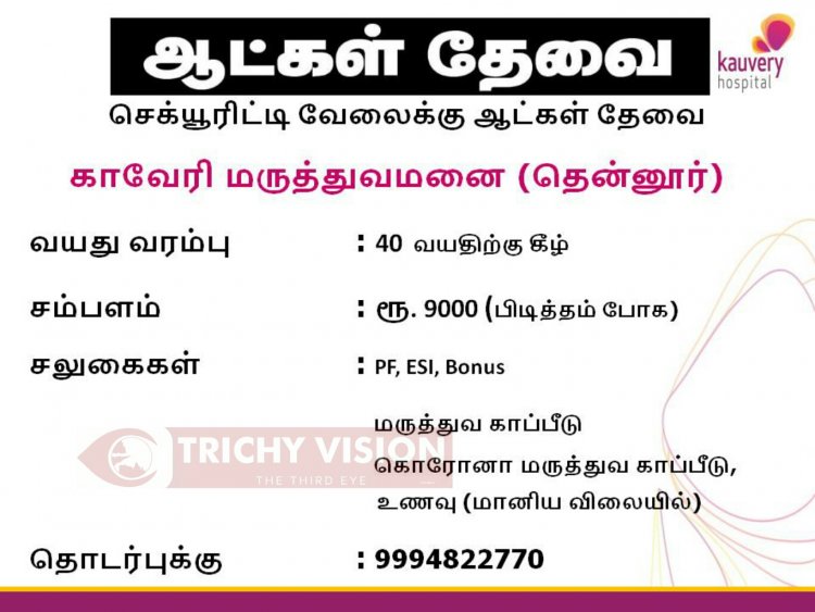 திருச்சி தென்னூர் காவேரி மருத்துவமனையில் கீழ்கண்ட பணியிடங்களுக்கு வேலை வாய்ப்புகள் அறிவிக்கப்பட்டுள்ளது. மேலும் விபரங்களுக்கு கீழே உள்ள படத்தை பார்க்கவும்.