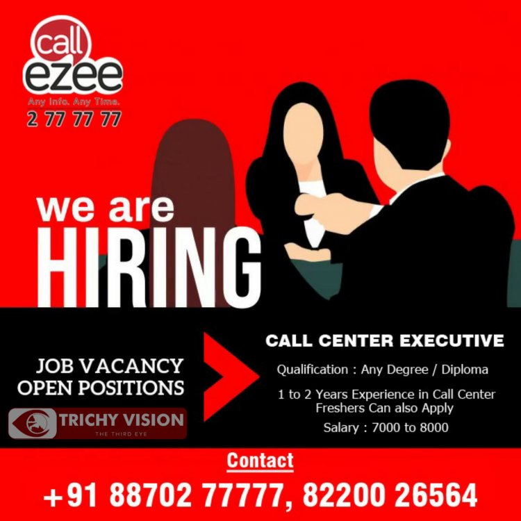 Call ezee கால் சென்டர் எக்ஸிக்யூட்டிவ் ஆக பணிபுரிய பட்டதாரி மற்றும் டிப்ளமோ படித்தவர்கள் தேவை. கால் சென்டரில் ஒரு வருடம் அல்லது இரண்டு வருடம் பணிபுரிந்த அனுபவம் உள்ளவர்களும் படித்து முடித்து அனுபவமில்லாதவர்களும் விண்ணப்பிக்கலாம். மாத வருமானம் 7000 ரூபாய் 8000 ரூபாய் தரப்படும்.மேலும் விபரங்களுக்கு கீழ்க்கண்ட தொலைபேசி எண்களை தொடர்பு கொள்ளவும்.