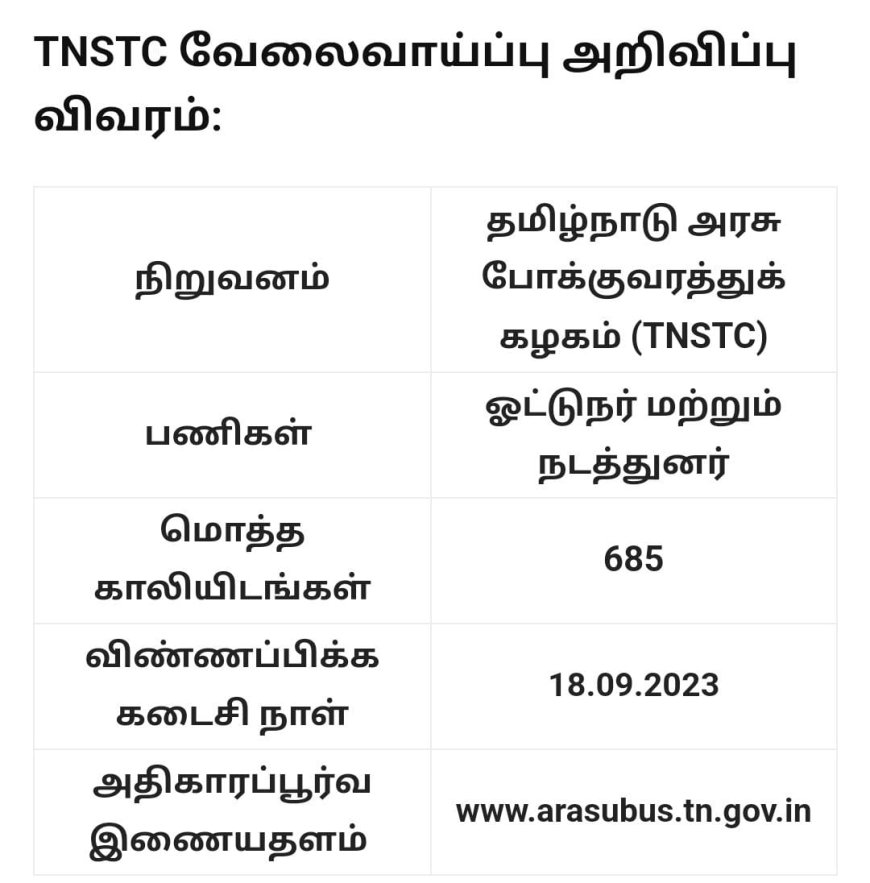 தமிழ்நாடு அரசு போக்குவரத்துக் கழகம் தற்பொழுது புதிய வேலைவாய்ப்பு அறிவிப்பு ஒன்றை அறிவித்துள்ளது. இந்த அறிவிப்பானது ஓட்டுநர் மற்றும் நடத்துனர் பணிகளுக்கு அறிவிக்கப்பட்டுள்ளது.