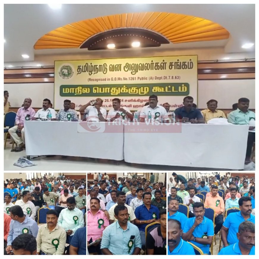 தமிழ்நாடு வன அலுவலர்கள் சங்கத்தின் மாநில பொதுக்குழு கூட்டம் திருச்சி மத்திய பேருந்து அருகில் உள்ள தனியார் திருமண மண்டபத்தில் மாநிலத் தலைவர் கார்த்திகேயன் தலைமையில் நடைபெற்றது.