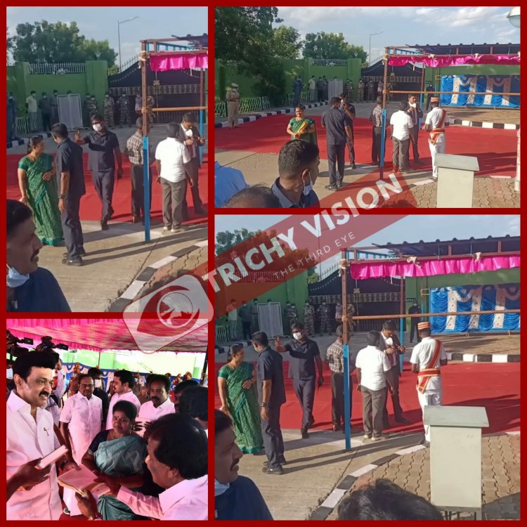திருச்சி மாநகராட்சி மேயர் முக்கிய நிர்வாகிகள் தொண்டர்கள் முதல்வரை வரவேற்க ஒரு மணி நேரம் முன்னதாக தங்களை சோதனைக்கு உட்படுத்தி வரவேற்கத் தயாராக இருந்தனர். மாநகராட்சி துணை மேயர் திவ்யா கடைசி நேரத்தில் தாமதமாக வந்து விமான நிலையம் வந்தார். பாதுகாப்பு பிரிவில் உள்ள போலீசார் துணை மேயரை முதல்வரை வரவேற்கும் பகுதிக்கு செல்ல அனுமதி மறுத்தனர். பின்னர் ஓரமாக நின்ற துணை மேயர் திவ்யா முதல்வர் சென்றவுடன் வேறு ஒரு காரில் ஏறி சென்றார்.