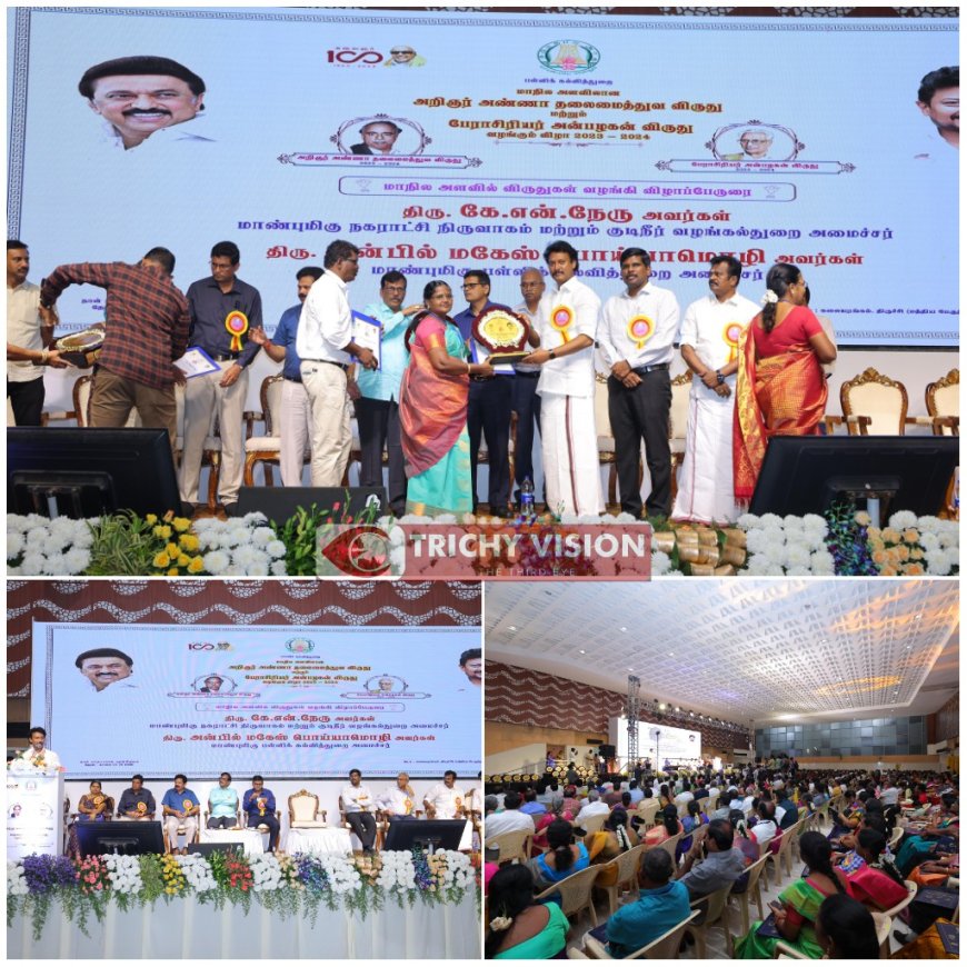 தமிழ்நாடு அரசு பள்ளிக்கல்வித்துறை சார்பில் அறிஞர் அண்ணா தலைமைத்துவ விருது, பேராசிரியர் அன்பழகன் விருது உள்ளிட்ட மாநில அளவிலான விருதுகள் வழங்கும் விழா திருச்சி கலையரங்கத்தில் இன்று நடைபெற்றது. இவ்விழாவிற்கு மாவட்ட ஆட்சியர் பிரதீப் குமார் தலைமை தாங்கினார். பள்ளிக்கல்வித்துறை அரசு செயலாளர் குமரகுருபரன் முன்னிலை வகித்தார். ஒருங்கிணைந்த பள்ளிக்கல்வி மாநில திட்ட இயக்குனர் ஆர்த்தி விளக்க உரையாற்றினார். விழாவில் நூறு ஆசிரியர்களுக்கு அண்ணா தலைமைத்துவ விருதும், 76 ஆசிரியர்களுக்கு பேராசிரியர் பேராசிரியர் அன்பழகன் விருதும் வழங்கி பள்ளிக்கல்வித்துறை அமைச்சர் அன்பில் மகேஷ் பொய்யாமொழி சிறப்புரையாற்றினார்.