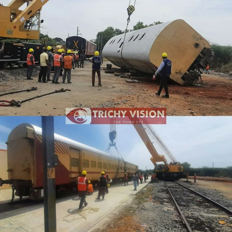 திருச்சி ரயில் நிலையத்தில் உள்ள அபாய சங்கு திடீரென ஒலித்தது. உடனே கட்டுப்பாட்டு அறைக்கு ரயில்வே பாதுகாப்பு மற்றும் மீட்பு படையினர் தொலைத் தொடர்பு கொண்டு திருச்சி குட்ஷெட் மேம்பாலம் அருகே ரயில் தடம் புரண்டு விபத்து ஏற்பட்டதாக தெரிவிக்கப்பட்டது.