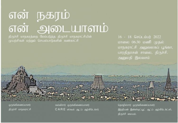 திருச்சி மாநகரத்தை மேம்படுத்த, திருச்சி மாநகராட்சி எடுக்கும் முயற்சிகள் மற்றும் அதன் செயல்பாடுகளின் கண்காட்சி, புதிதாக சீரமைக்கப்பட்ட மாநகராட்சி அலுவலக பூங்காவில், செப்டம்பர் 16,17, 18 ஆகிய மூன்று நாட்கள் நடைபெற உள்ளது.