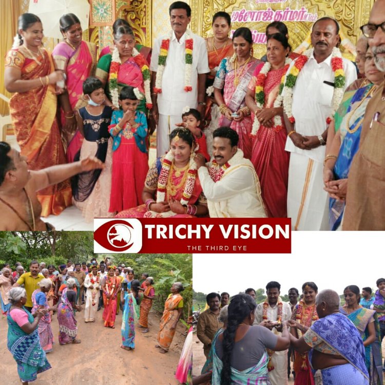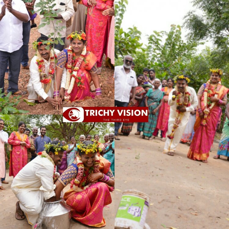 புதுமண தம்பதிகள் திருமண மண்டபத்தை விட்டு நேரடியாக அடர்வன காடுகள் இருக்கும் பகுதிக்கு சென்றனர். அங்கு பணி புரியும் வயதான பெண்கள் இவர்களுக்கு உற்சாகமான வரவேற்பு அளித்தனர். தலையில் பூக்களால் ஆன கிரீடம் அணிவித்து ஆரத்தி எடுத்து வரவேற்றனர். கைதட்டி , பாட்டு பாடி நடனமாடி புதுமண தம்பதிகளை உள்ளே அழைத்து சென்றனர். புதுமணத் தம்பதிகளுக்கு போட்டிகள் நடத்தப்பட்டது. மேலும் இருங்களூர் ஊராட்சி மன்ற தலைவர் வின்சென்ட் உள்ளிட்டோரும் விளையாட்டு இப்போட்டிகளில் பங்கேற்றனர்.