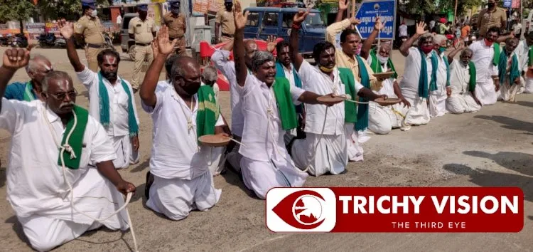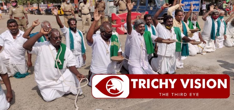 இந்நிலையில் திருச்சியில் புதிய வேளாண் சட்டத்தை திரும்பப் பெறக் கோரி திருவோடு ஏந்தி ,கழுத்தில் தூக்கு கயிறு மாட்டி, நெற்றியில் நாமம் இட்டு மண்டியிட்டு விவசாயிகள் நூதன போராட்டத்தில் ஈடுபட்டனர்.