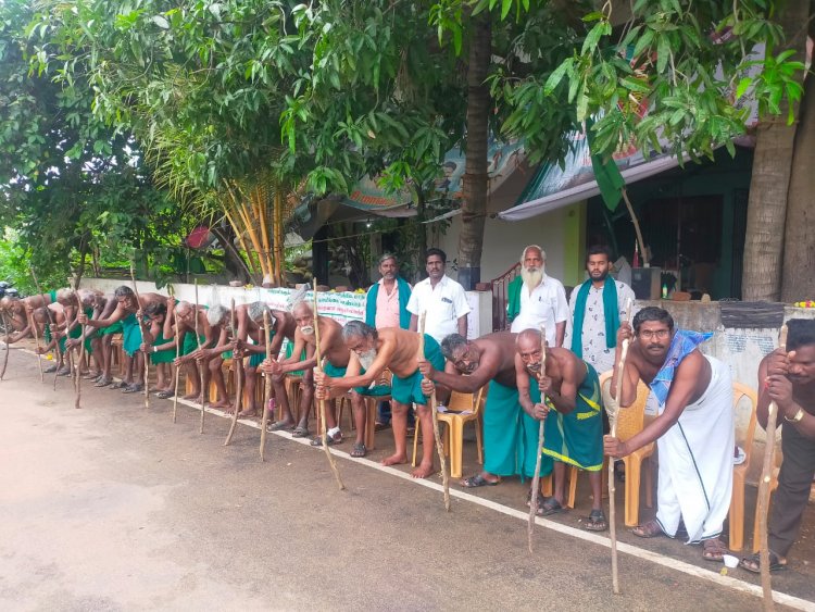 கரூர் பைபாஸ், மலர் சாலையில் உள்ள இச்சங்கத்தின் மாநில தலைவர் இல்லத்தில் நடைபெறும் இப்போராட்டம் இருபதாவது நாளாக இன்று நடைபெற்றது. இதில் விவசாயிகள் இந்த நாட்டின் முதுகு எலும்பு என்று தேர்தலின்போது கூறிய  பிரதமர் மோடி லாபகரமான விலை கொடுக்காமல் விவசாயிகளை ஏமாற்றியதோடு மூன்று வேளாண் சட்டங்களை வாபஸ் வாங்காததாலும், விவசாயிகளின் முதுகெலும்பை பிரதமர் மோடி  உடைத்துவிட்டார் என்பதற்காக குச்சி ஊன்றிக்கொண்டு விவசாயிகள் இன்று போராட்டத்தில் ஈடுபட்டனர்.