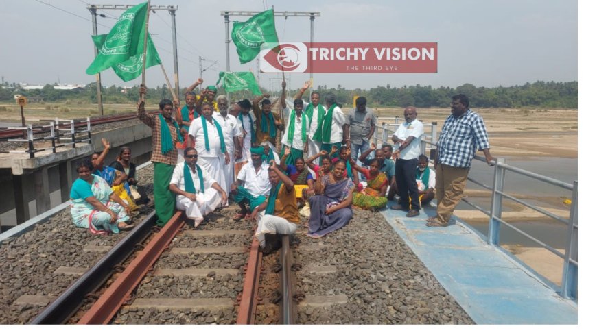 விவசாயிகள் திருச்சி காவிரி ரயில் பாலத்தில் (15.02.2024) இன்று கோவனதுடன் போராட்டம் நடத்தினர். இதைப் பற்றி தகவல் அறிந்து வந்த கோட்டை காவல் நிலைய போலீசார் தண்டவாளத்தில் அமர்ந்து போராட்டம் நடத்திய விவசாயிகளிடம் பேச்சுவார்த்தை நடத்தினர் சுமார் ஒரு மணி நேரம் கழித்து இந்தப் போராட்டம் கைவிடப்பட்டது.