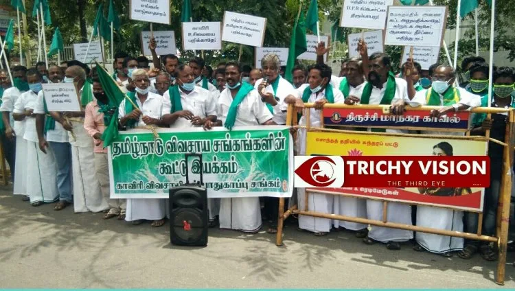 முன்னதாக  கோரிக்கைகளை வலியுறுத்தி திருச்சி மத்திய பேருந்து நிலையத்தில் இருந்து பச்சைக் கொடியுடன் ஊர்வலமாக செல்ல திட்டமிட்டனர். ஆனால் அதற்கு போலீசார் அனுமதி மறுத்த காரணத்தால் தலைமைத் தபால் நிலையம் அருகே நூற்றுக்கும் மேற்பட்டோர் கண்டன ஆர்ப்பாட்டத்தில் ஈடுபட்டனர்.