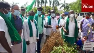 சாக்கடை கழிவுநீரை விவசாய நிலத்தில் விட கூடாது, விவசாயத்திற்கு உள்ள இலவச மின்சாரத்தை ரத்து செய்ய கூடாது, விவசாய விளைபொருட்களுக்கு இலாபகரமான விலை வழங்க வேண்டும், 60 வயதிற்கு மேற்பட்ட விவசாயிகளுக்கு மாதம் ஓய்வூதியம் ரூ. 5000/- வழங்க வேண்டும், காவிரி – அய்யாறு – உப்பாறு திட்டத்திற்கு நிதி ஒதுக்கி நிறைவேற்ற வேண்டும், நதிகளை இணைக்க வேண்டும், விவசாயிகள் வாங்கிய அனைத்து கடன்களையும் தள்ளுபடி செய்ய வேண்டும் போன்ற கோரிக்கைகளை வலியுறுத்தி தேசிய தென்னிந்திய நதிகள் இணைப்பு விவசாயிகள் சங்க தலைவர் அய்யாக்கண்ணு தலைமையில் விவசாயிகள் திருச்சி மாவட்ட ஆட்சியர் அலுவலகம் முன்பு தரையில் படுத்து காத்திருப்பு போராட்டம் நடத்தினர்.