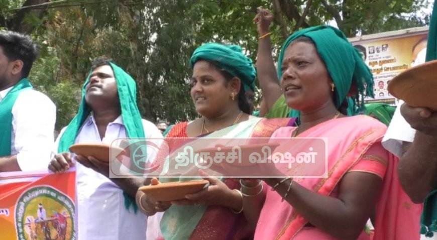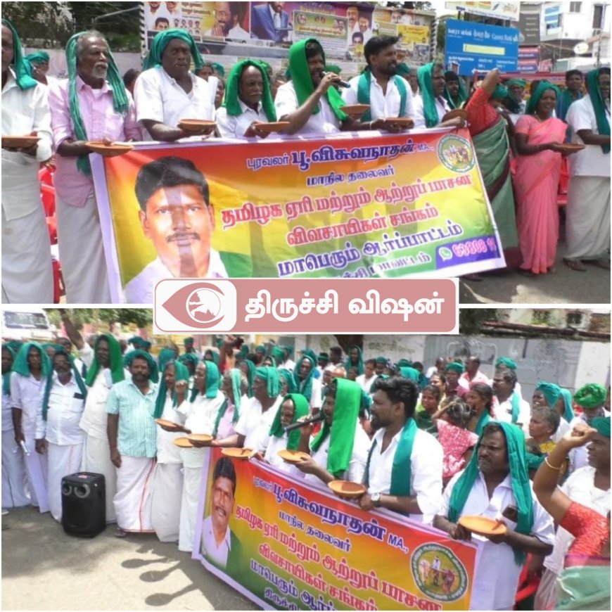 கர்நாடகாவில் இருந்து தமிழ்நாட்டிற்கு உரிய தண்ணீரை திறந்து விட வேண்டும் உள்ளிட்ட பல்வேறு கோரிக்கைகளை வலியுறுத்தி திருச்சியில் விவசாயிகள் தலையில் துண்டு போட்டு கையில் திருவோடு ஏந்தி ஆர்ப்பாட்டத்தில் ஈடுபட்டனர்