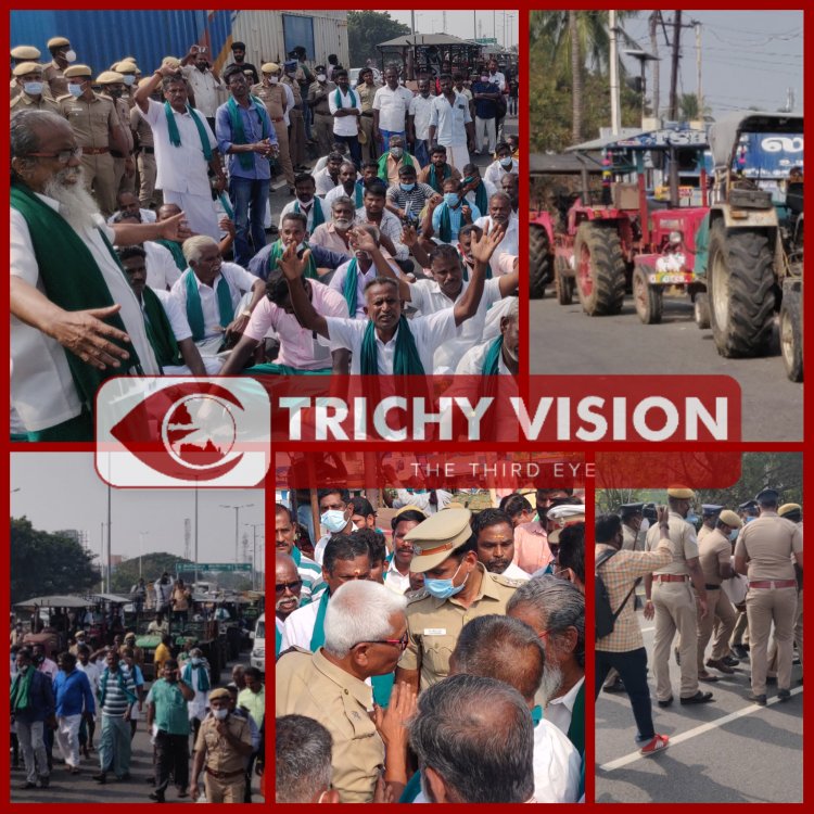 திருச்சி சென்னை தேசிய நெடுஞ்சாலை இணைப்பு சாலையில் டிராக்டரில் உடன் செல்ல தயாராக இருந்த விவசாயிகள் அனைவரையும் காவல்துறையினர் தடுத்து நிறுத்தினர். 300க்கும் மேற்பட்ட போலீசார் பாதுகாப்பு பணியில் ஈடுபட்டனர். கர்நாடக அரசு மேகதாதுவில் அணை கட்டக்கூடாது .கடலுக்கு சென்று வீணாகும் காவிரியின் வெள்ள நீரை அய்யாற்றுடன் இணைப்பது தமிழக பகுதியில் பெய்யும் மழை நீர் ஆலடியாறு அணைக்கு சென்று வீணாக கேரள கடலில் கலப்பதை தடுத்து தமிழகத்தில் உள்ள அணை வறண்ட   பகுதிகளுக்கும் கொண்டு வருவதற்க்கு திட்டத்தை செயல்படுத்த வேண்டும். விவசாயிகளின் ஒரு லட்சம் கோடி கடனை தள்ளுபடி செய்யாமல் இருக்கும் மத்திய அரசை கண்டிப்பது உள்ளிட்ட கோரிக்கைகளை வலியுறுத்தி இந்த போராட்டம் நடைபெறுவதாக தெரிவித்துள்ளனர்.