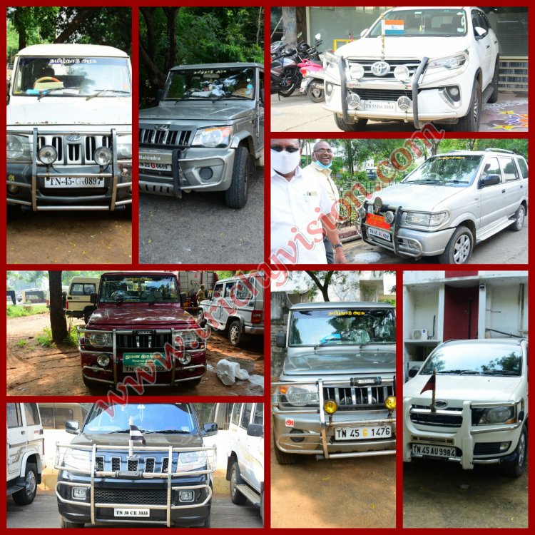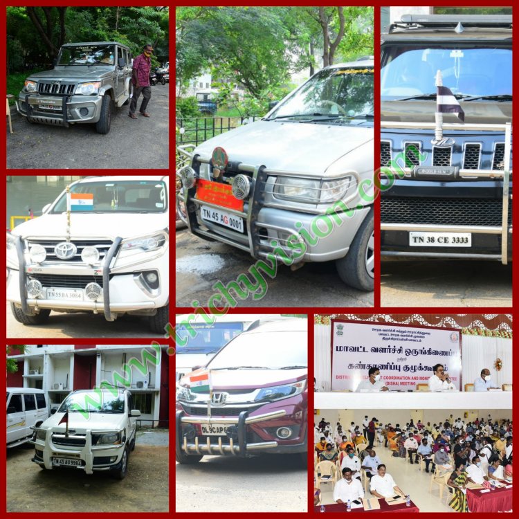 திருச்சி கலையரங்கம் மண்டபத்தில் பாராளுமன்ற உறுப்பினர் திருநாவுக்கரசர் தலைமையில் வளர்ச்சித் திட்டங்கள் குறித்த ஆய்வுக் கூட்டம் கடந்த 28.10.2021ம் தேதி நடைபெற்றது. இதில் மாவட்ட நிர்வாகத்தில் உள்ள அனைத்து துறை அதிகாரிகளும் பங்கேற்றனர். அப்போது தான் இந்த காட்சிகள் அரங்கேறியது. பாராளுமன்ற உறுப்பினர்களிலிருந்து உதவி இயக்குனர் உள்ளிட்ட மாவட்ட நிர்வாகத்தில் பணிபுரிகின்ற அரசு அதிகாரிகளின் வாகனங்களிலேயே இன்னும் பம்பர் அகற்றப்படாமல் உள்ளது.