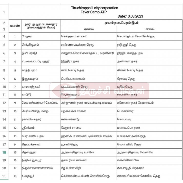 திருச்சி மாநகரில் நாளை (13.03.2023) காய்ச்சல் முகாம்  நடைபெறும் இடங்கள்